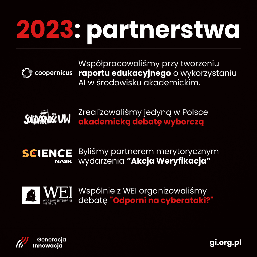👉 W ramach partnerstw współpracowaliśmy w szeregu działań - od debat, przez raporty i wydarzenia. Jednym z nich była jedyna w Polsce wyborcza debata akademicka!