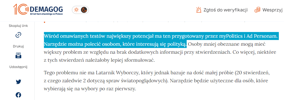 Ponad to, nasz produkt został pozytywnie oceniony przez największe w Polsce stowarzyszenie fact-checkingowe Demagog. W analizie Demagoga nasz quiz został opisany jako kwestionariusz z największym potencjałem, jednak z uwagi na złożoność poruszanych tematów, mógł docierać raczej do tych bardziej zainteresowanych polityką wyborców.